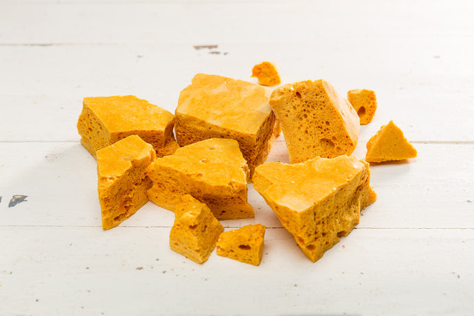 Sea Foam(also known as Sponge Candy) get its name from its appearance. It definitely resembles the appearance of Sea Foam you would find on the World's most Famous Beach.